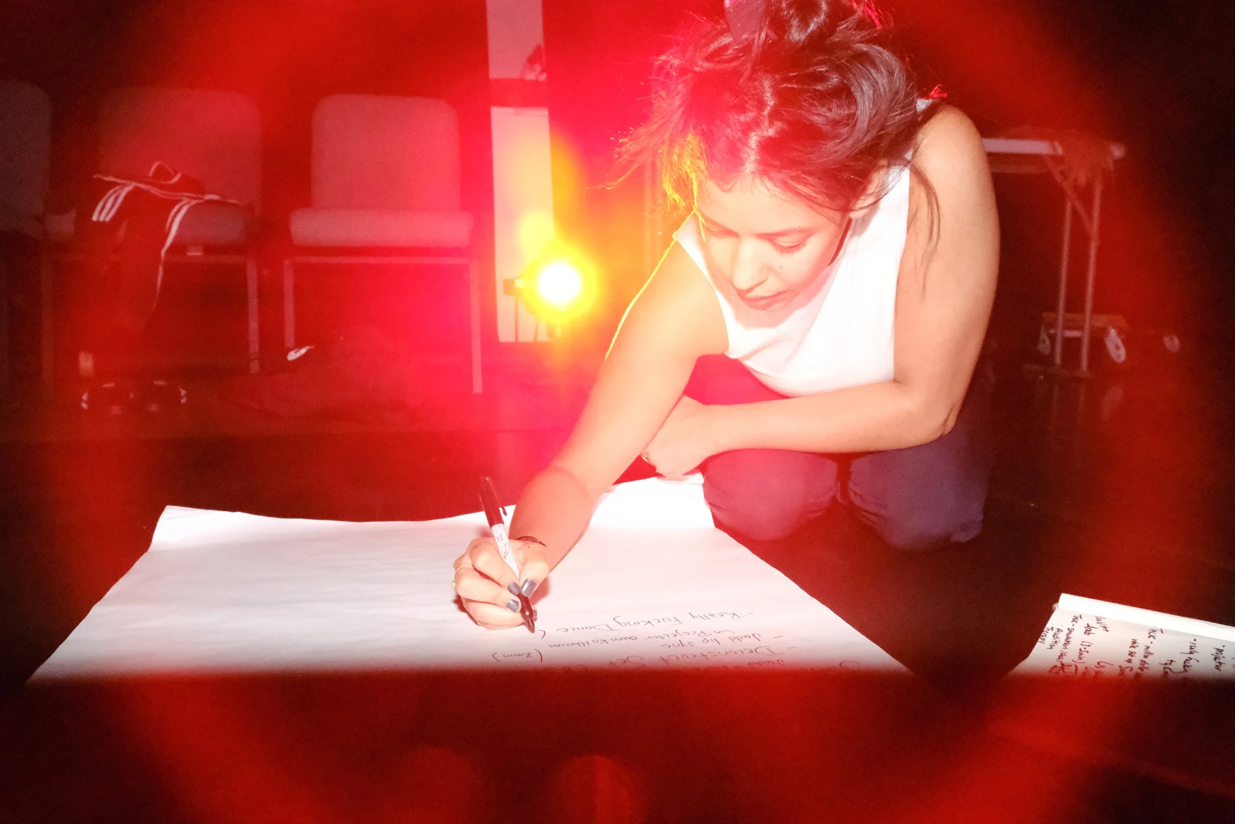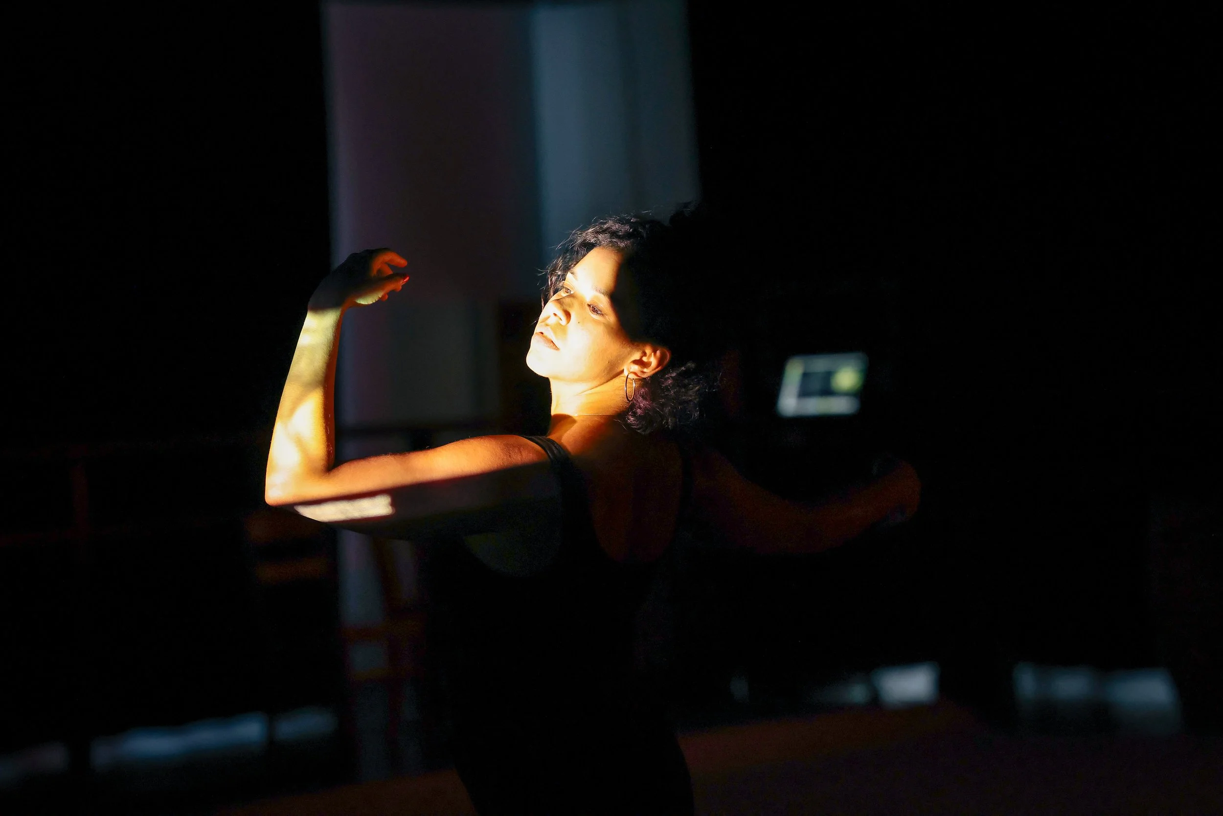 Through my choreographic works, I inhabit the in-between spaces. I create worlds which are built to collapse, exposing contradictions and similarities understood by people from minoritarian communities. Playing with gaze and excessive generosity, I embody hospitality to create experiential performances that ask questions about being seen, who is doing the seeing, and when we are in control of these perceptions. I deconstruct and integrate historically disparate dance forms through multi-modal investigations to ask: Where does desire live in the alienated body and how can it be liberated, traced, sensed, and transformed? How do we sustain feeling deeply?